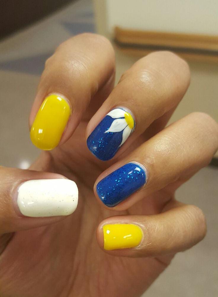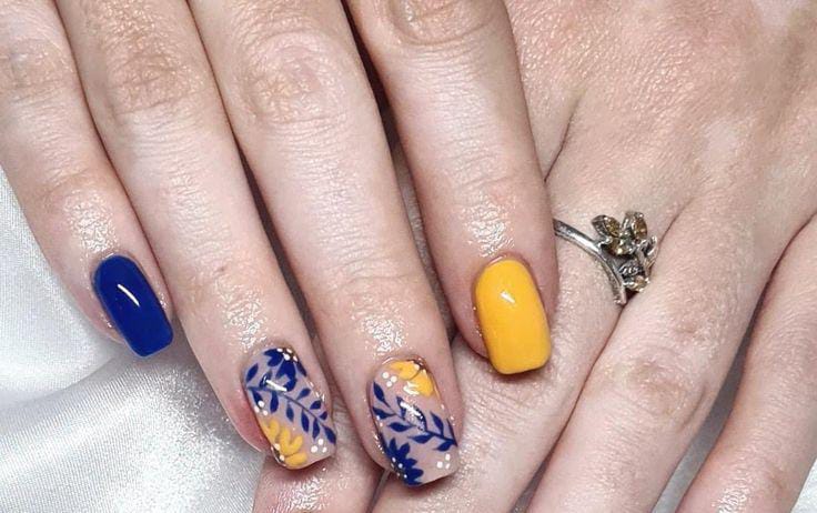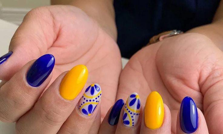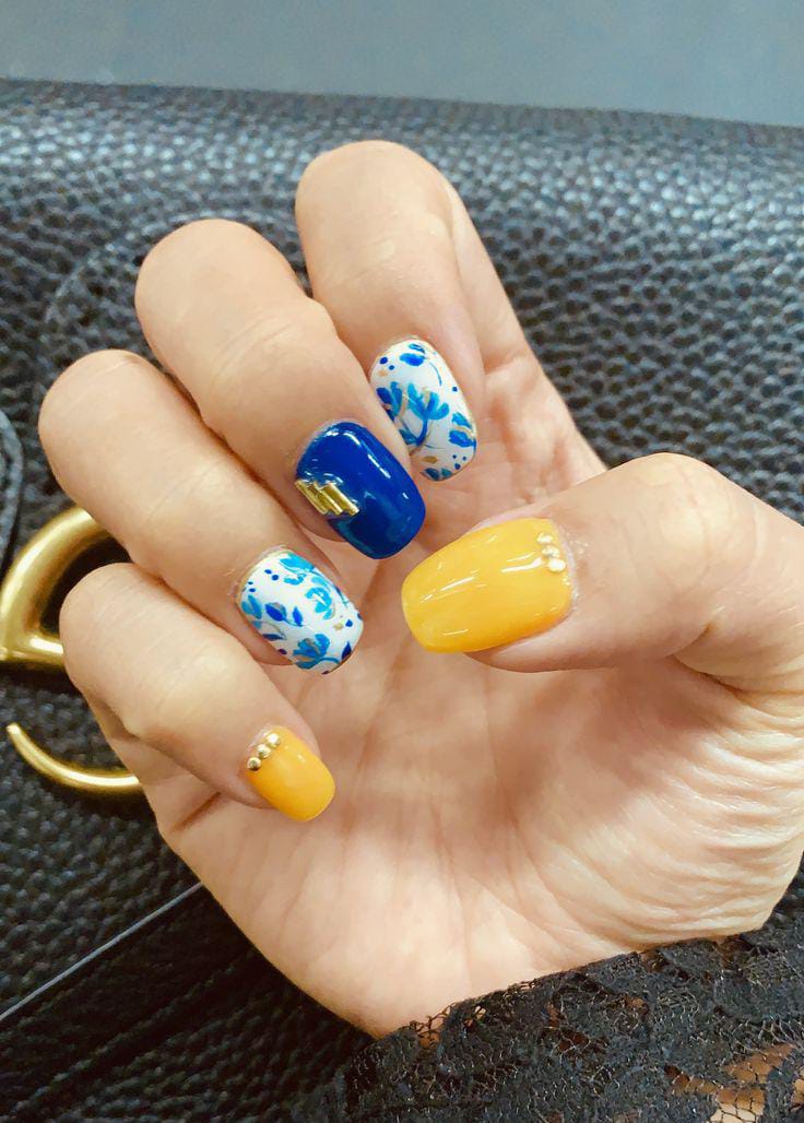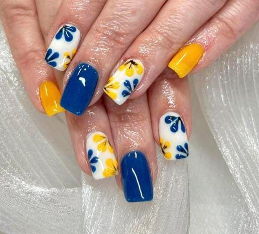 This design combines bold blue with a pop of yellow and intricate floral patterns on white base subtle gold details. The mix of solid and decorated nails creates an elegant yet trendy spring feel.