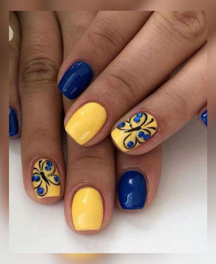 This design features a combination of bold blue and yellow nails with a hand-painted butterfly pattern in blue, subtle blue stones. The design is delicate yet vibrant, creating a balanced spring look.