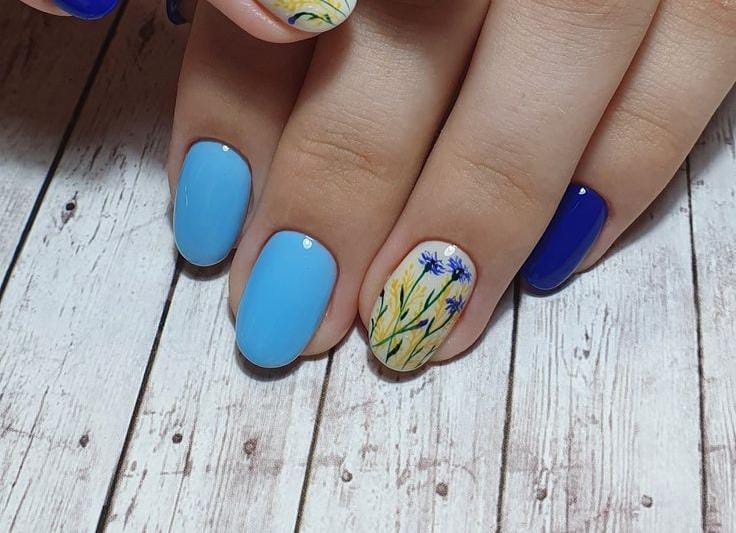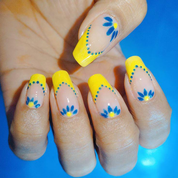 A mix of solid blue and yellow tip nails with delicate flower and dots accents on a blue base. This design has a calm, fresh spring look with a hint of creativity.
