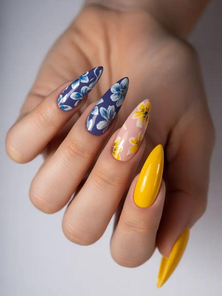 This design incorporates vivid yellow and blue nails with blue and yellow floral art on the accent nails. The combination of bright colors and floral details brings a lively and sunny spring aesthetic.