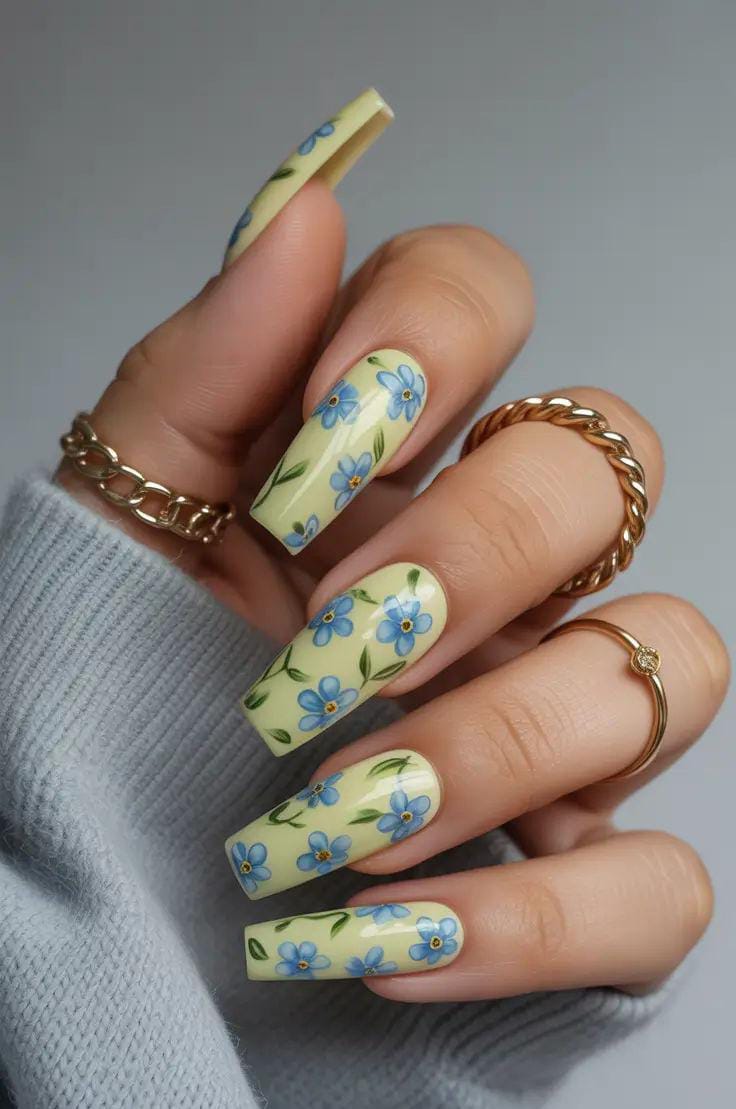 Buttery yellow nails with soft blue flowers and green leaves give a floral, nature-inspired look. It’s a simple and charming design, perfect for a bright and fresh spring feel.