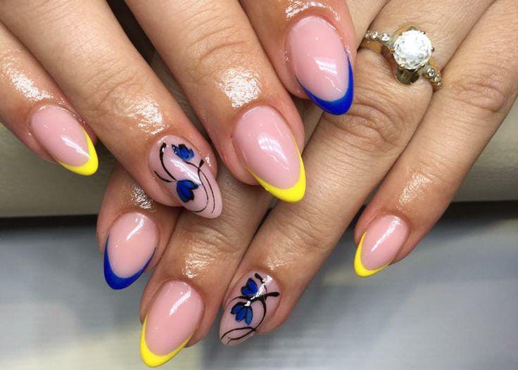 A playful twist on the classic French manicure, with blue and yellow tips on nude accents featuring floral designs. The combination of bold colors and fine details creates a fun yet elegant spring look.