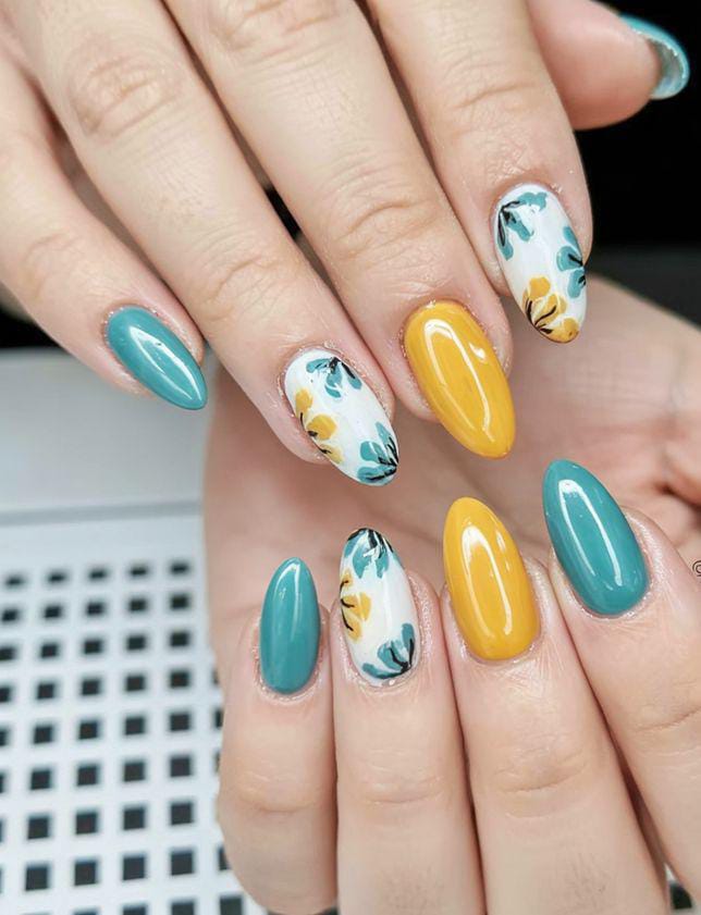 This design features a cheerful combination of yellow and teal nails, with one accent nail showcasing a bold flower pattern. It gives off a fun, playful vibe perfect for spring.