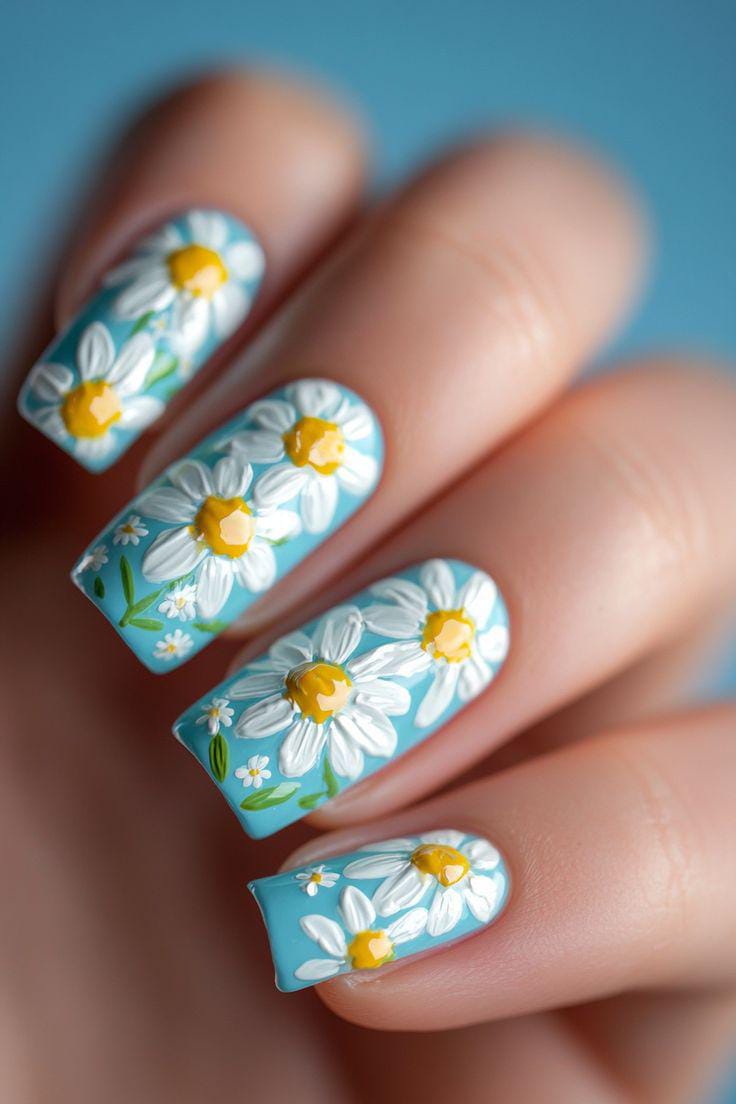 This design incorporates soft blue and yellow with small daisy details, creating a fresh and fun spring aesthetic. The design feels light and perfect for warm seasons.