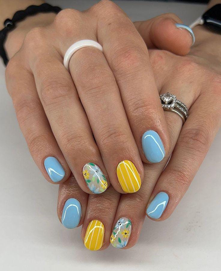 A playful and balanced mix of yellow and blue, with one white nail showcasing a floral design in matching shades. The overall look is cheerful and perfect for a spring theme.