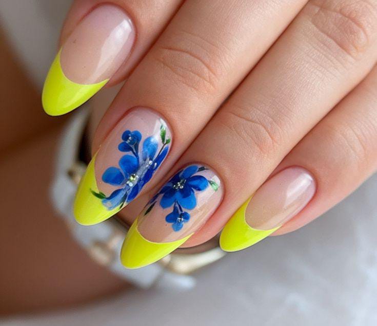 A neon yellow French tip paired with vibrant blue flowers on a natural base creates a fun, bold spring design. The combination of bright colors makes this look stand out.